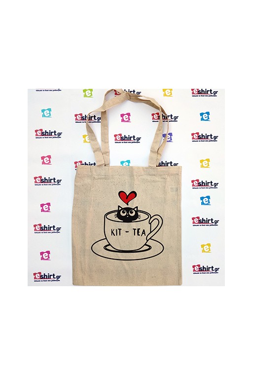 Υφασμάτινη tote bag με τη φράση “Kit Tea” και ένα χαριτωμένο σκίτσο γάτας που ξεπροβάλλει μέσα από ένα φλιτζάνι τσαγιού. Απαλή, παιχνιδιάρικη και ιδανική για λάτρεις των γατών και του τσαγιού.