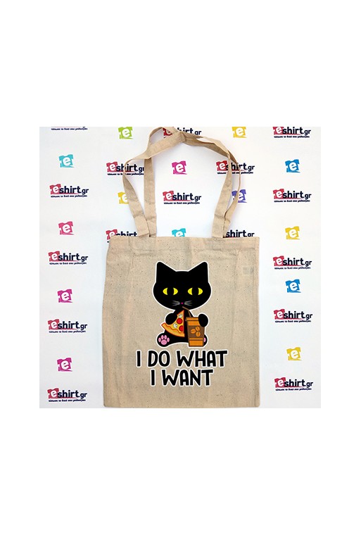 Υφασμάτινη tote bag με τη φράση “I Do What I Want” και σκίτσο από ένα μαύρο γατί που τρώει πίτσα και πίνει καφέ.